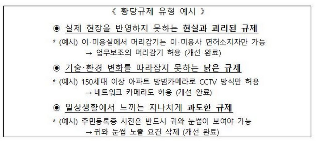 이러한 ‘황당규제’가 무엇인지 이해를 도울 수 있도록 그간 정부가 개선한 황당규제 사례를 아래와 같이 소개한다.